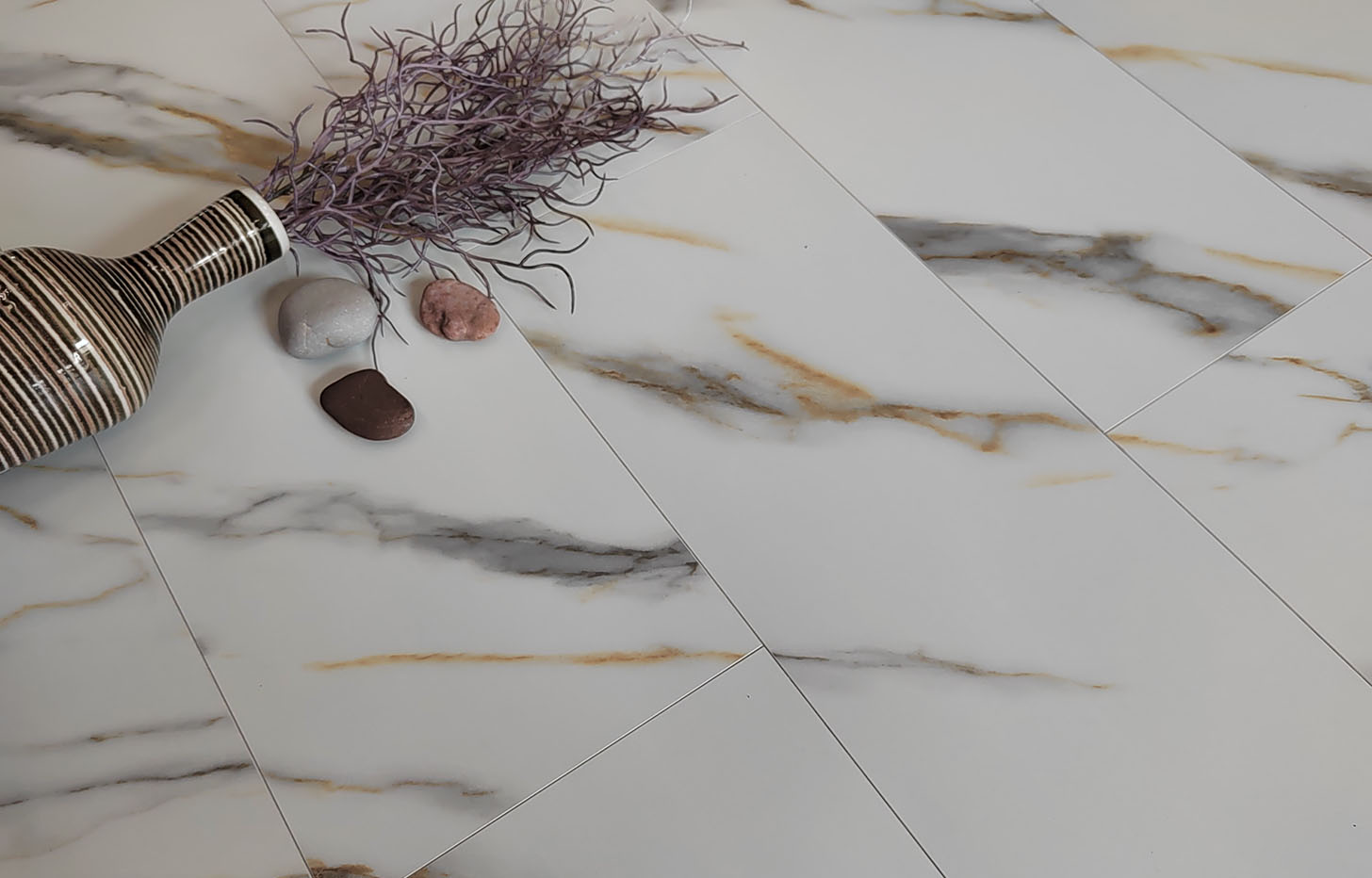 Минерально-каменный MSPC ламинат Мрамор Бело-Золотой — это декор, имитирующий изысканную текстуру белого мрамора, в формате большой крупной плитки (Big Stone) размером 1220*234 мм. Бело-золотой Мрамор имеет 4-сторонюю глубокую V-образную фаску. Так как сам материал обладает 100 % водостойкостью и крайне низким коэффициентом термореактивности, этот дизайн используют при укладке во всех зонах квартиры и зачастую там, где теплый пол является основным источником отопления. Без пороговая укладка в помещениях — до 240 м2. Возможность монтажа под тяжелую мебель — да. Возможность нагрева до +70° С без потери гарантии (может выдержать аварийный нагрев до + 114 С). Есть антивандальная обработка поверхности от появления царапин и выцветания на солнце.