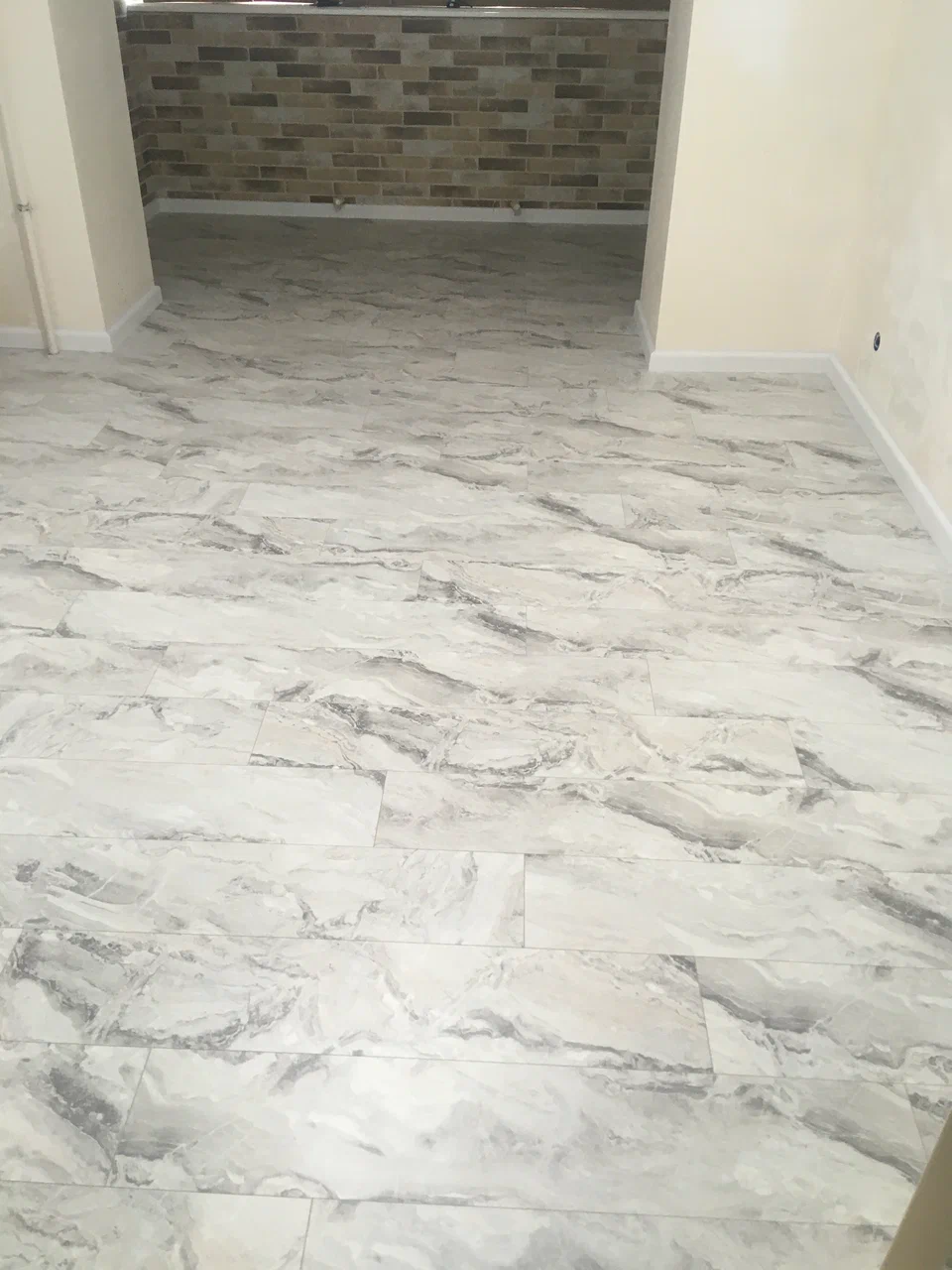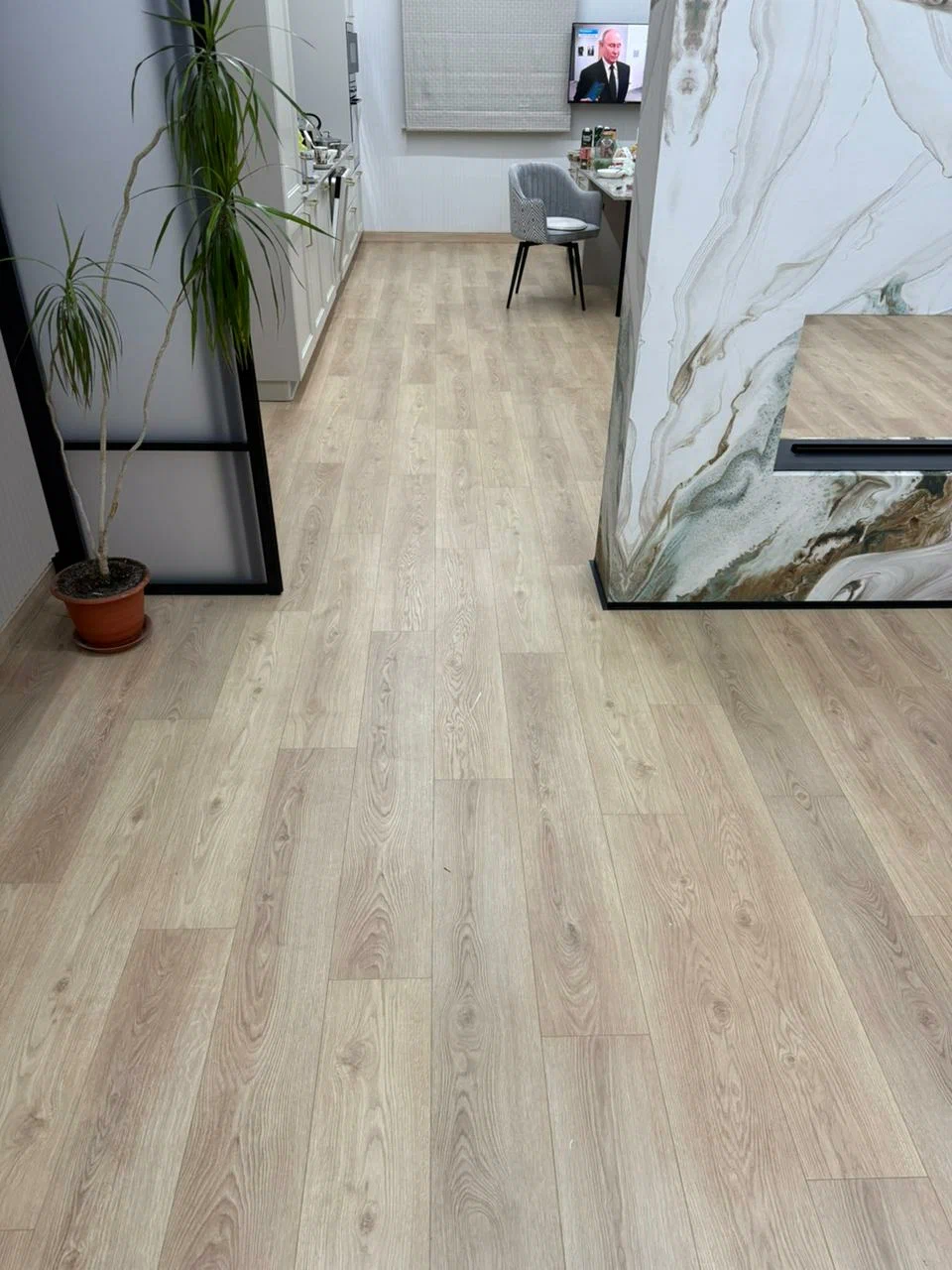 Практичный в плане влагостойкости, грязи и всего остального. И красиво. Незаметен переход от гостиной в сторону рабочей зоны, где кухня. Мне очень нравится, очень комфортно.