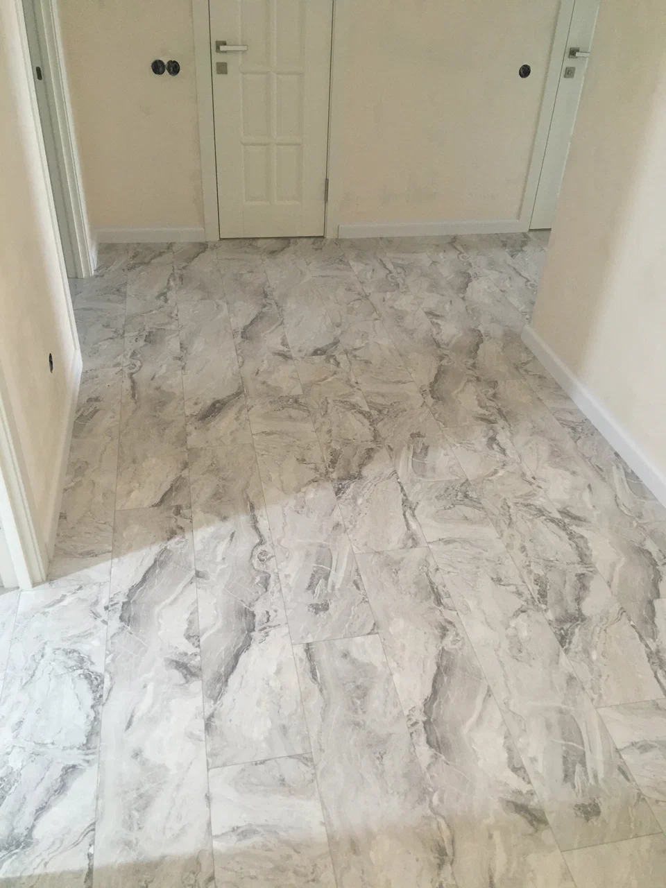 Уложили MSPC — новый материал на рынке. Каменный ламинат, так сказать, уложен ёлочкой. Много конвекторов. Примыкания к конвекторам обыграются планкой.