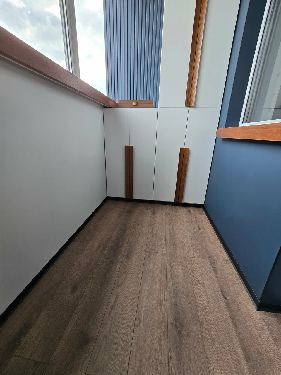 Покрытие уложено практически везде, кроме ванной, санузла и лоджии. Изначально это была трехкомнатная квартира площадью 75 квадратных метров. Мы перепланировали её в полноценную «двушку» с небольшими спальнями и одной большой зоной кухни-гостиной.